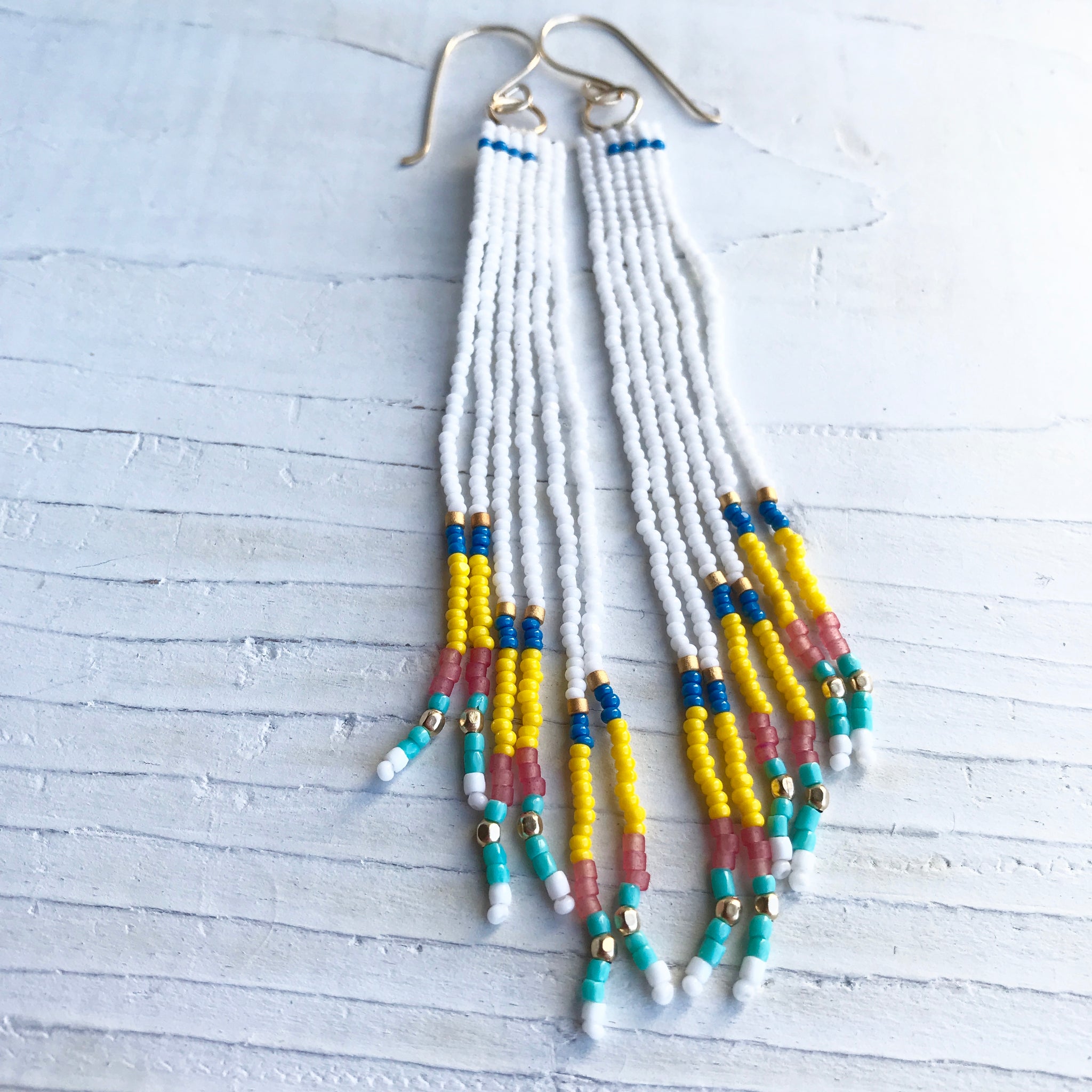 Handmade beaded earrings made with teenie tiny Charlotte cut beads in white, blue, yellow, pink and turquoise. Hooks are 14K gold filled. Approximately 3.5" long.
