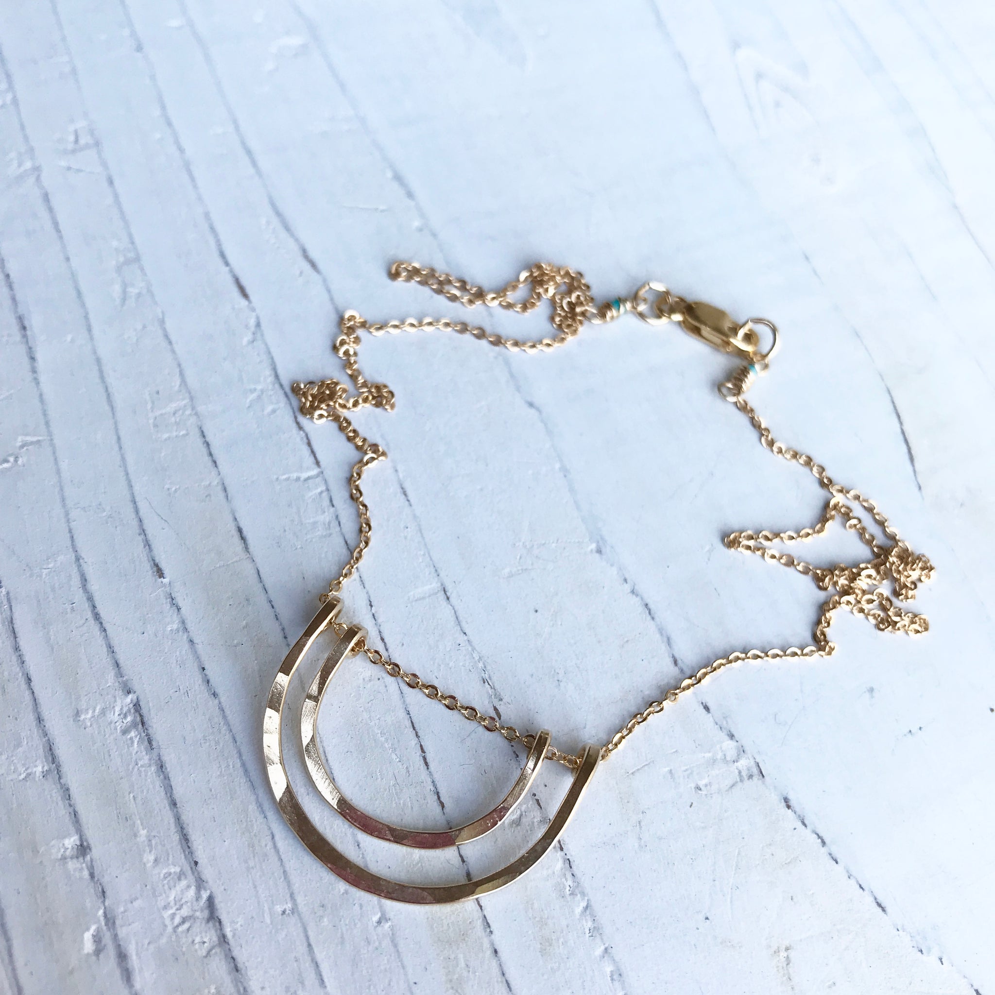 Lazo means loop in Spanish. Sosie means double or look-alike in French. Put them together and they make a stunning combination that you will not want to remove from your neck. Ever. 14K gold filled hammered loops on a 14K gold filled 18" chain.